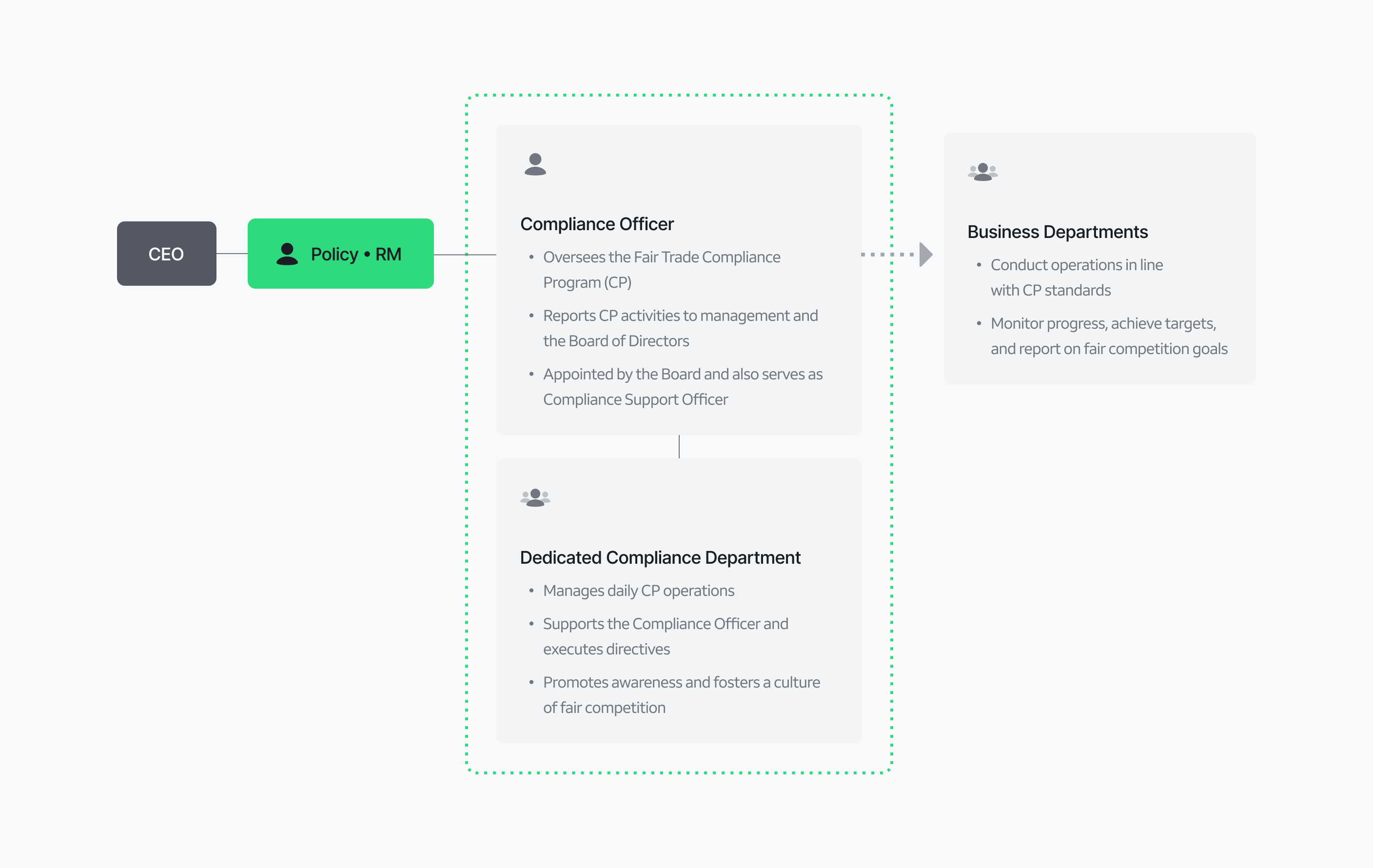 1CP 기준과 절차 마련 및 시행공정거래 자율준수를 위해 명확한 기준과 체계적인 내부 절차를 수립합니다.