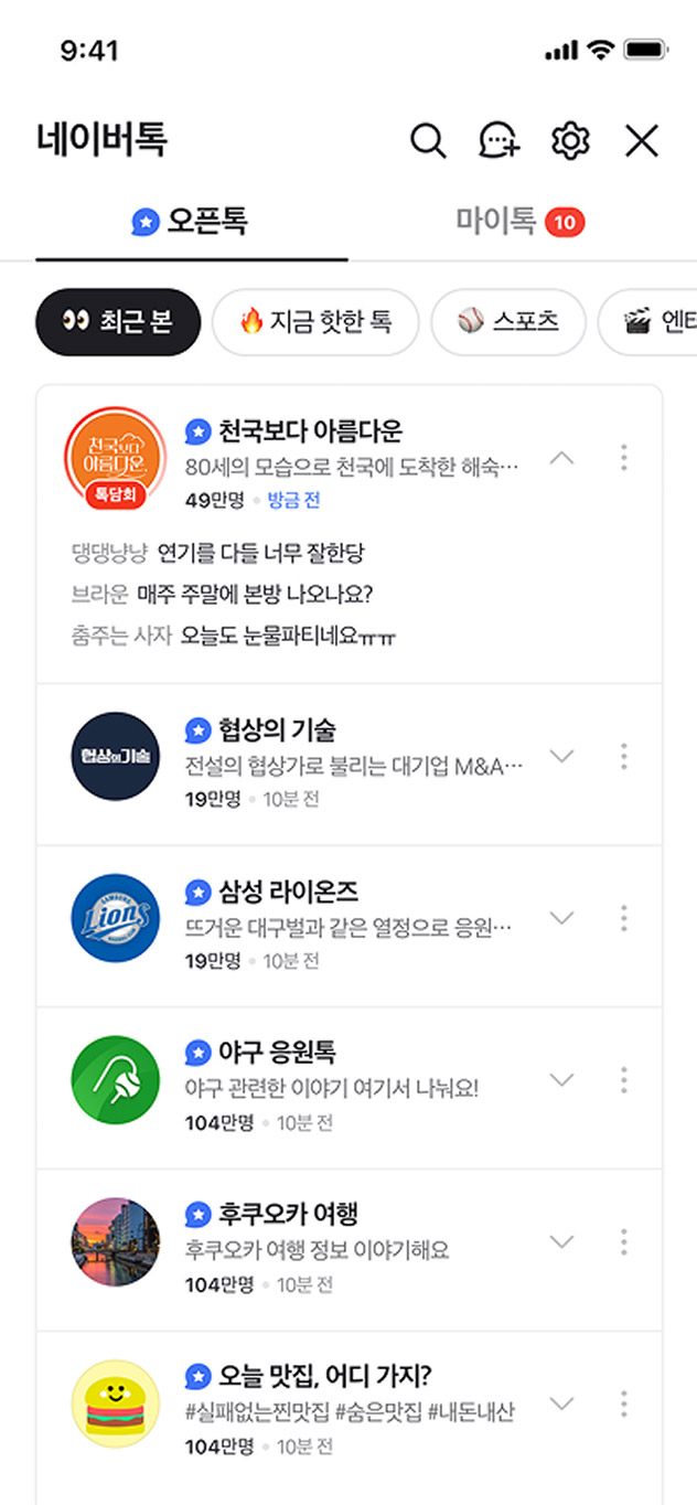 네이버톡은 네이버 포털 내의 모든 대화를 하나의 공간으로 모아낸 서비스입니다. 엔터, 스포츠, 경제 등 다양한 주제로 만들고 참여하는 오픈형 대화 서비스 '오픈톡'부터 네이버 친구, 카페 멤버, 스마트스토어 사업자와의 대화까지 네이버톡에서 참여할 수 있습니다.