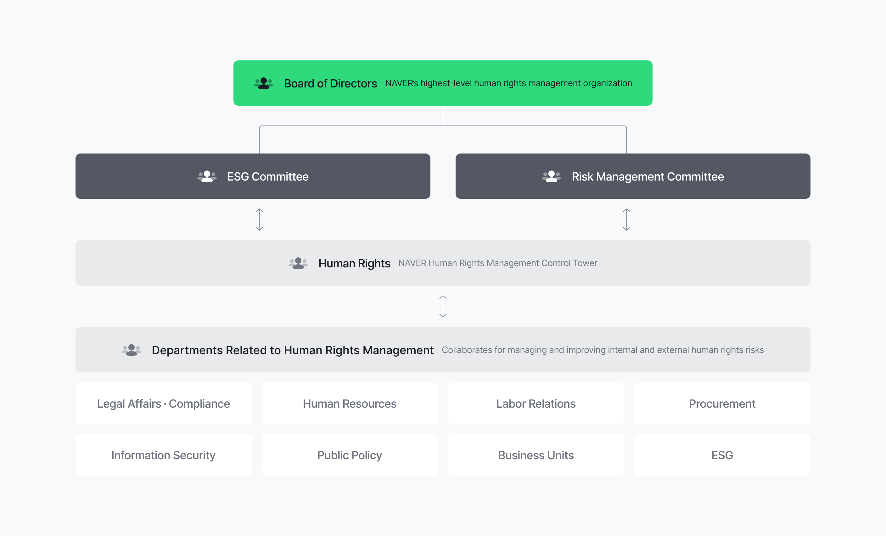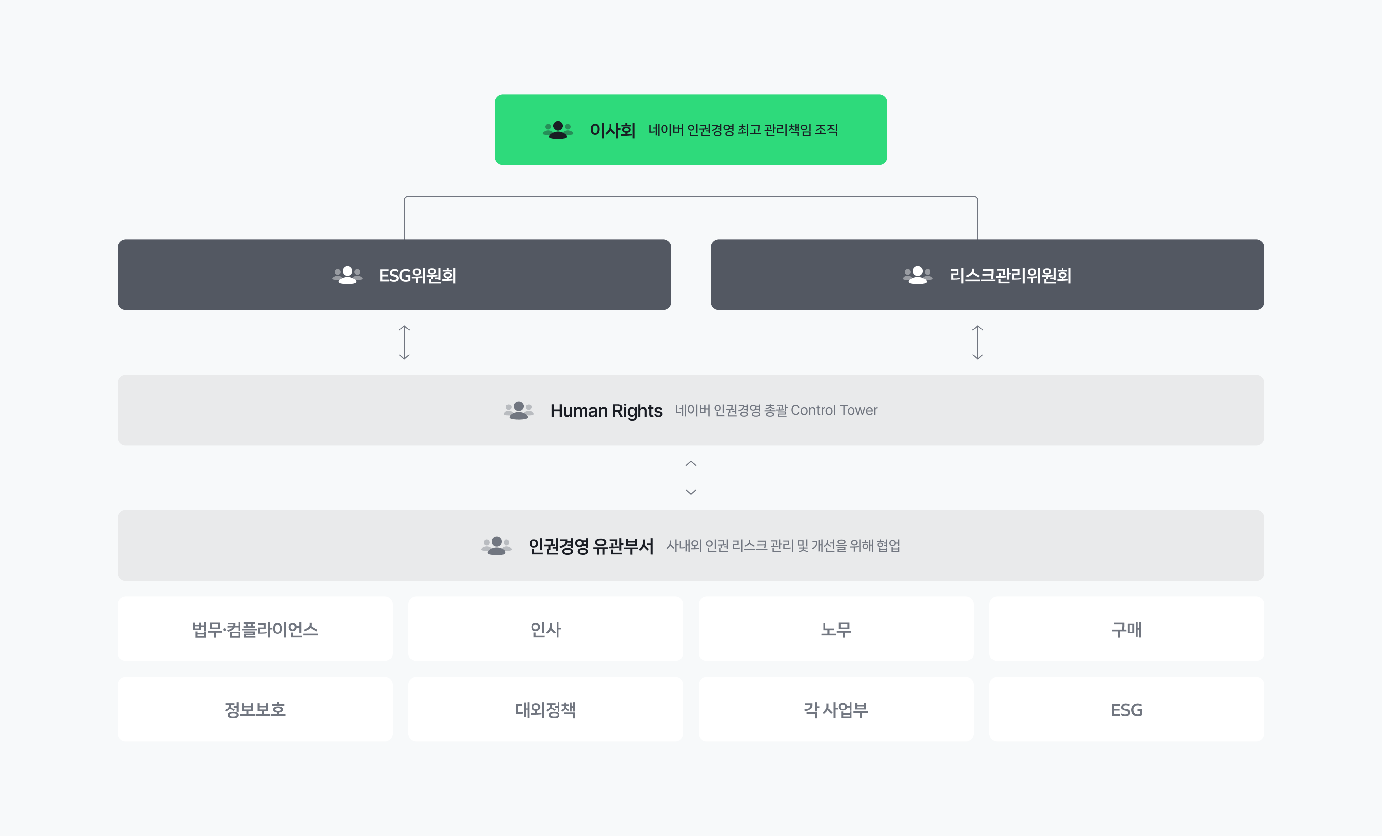 네이버는 인권 리스크를 체계적이고 정례적으로 관리하기 위해 자체 인권경영 진단 프레임워크를 개발, 운영하며 지속가능한 인권경영을 실천합니다.