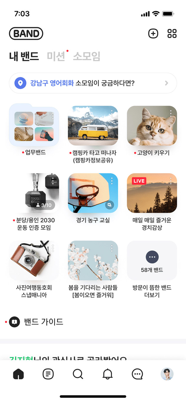 네이버 밴드는 학교, 동아리, 회사 등 지인 모임부터 취미나 관심 정보를 나누는 모임까지 다양한 그룹에서 커뮤니케이션을 위해 사용하는 서비스입니다. 한국뿐 아니라 북미와 일본 시장에서 그룹을 위한 커뮤니케이션 도구 서비스로 자리매김하고 있습니다.