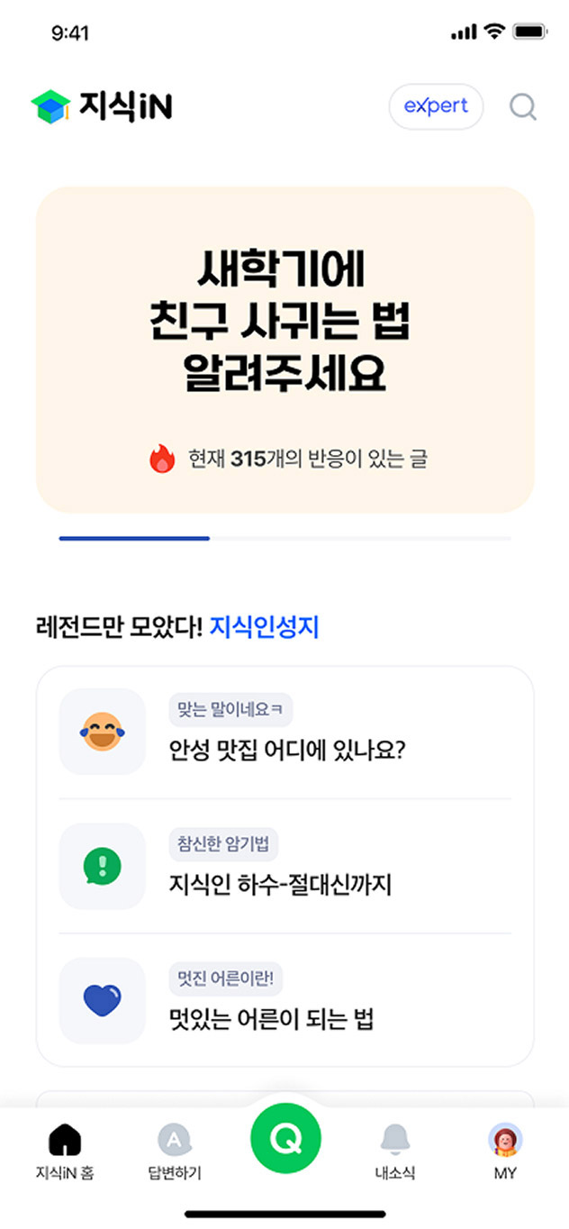 네이버 지식iN은 누적 Q&A 10억 건을 보유 중인 대한민국 대표 지식 플랫폼입니다. 20년이 넘은 지금도 사용자들의 소소한 일상 고민부터 전문 영역까지 다양한 문제를 해결하고 있으며, eXpert를 통해 각 분야의 전문가와 1:1 상담 서비스도 제공하고 있습니다.