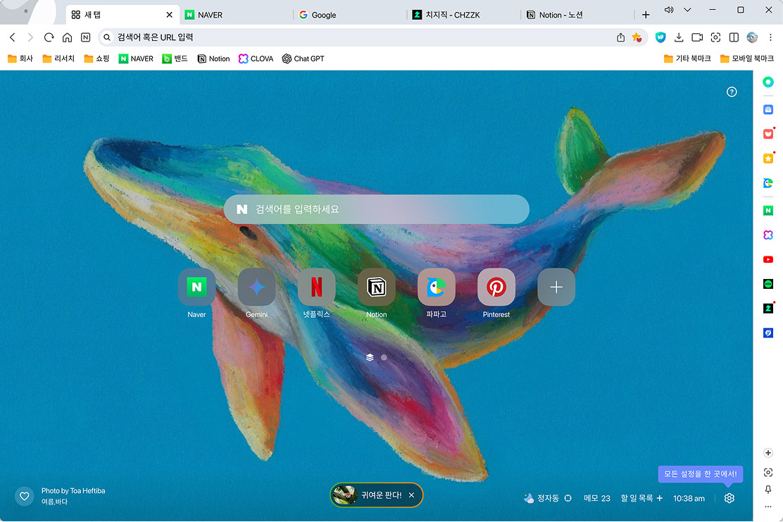 네이버 웨일은 브라우저 기반 웹서비스 통합 플랫폼으로, 쉽고 빠른 탐색은 물론 모든 기기를 연결하는 동기화, 위조 사이트 차단 등 다양한 기능으로 웹 탐색의 새로운 경험을 제공합니다.