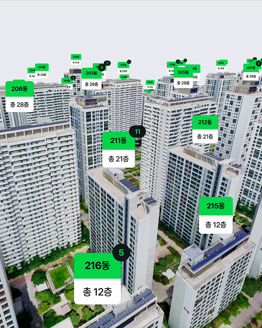 아파트 단지와 매물을 3D 디지털 트윈으로 구현해 자유롭게 탐색할 수 있으며, 건물 높이, 일조량, 면적, 층고, 인테리어 구조 등 다양한 정보를 확인할 수 있습니다. -